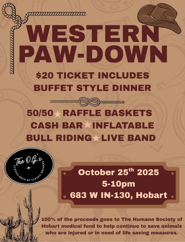 Y’all are invited to dust off your cowboy boots and join us for a rootin’-tootin’ good time—all for a great cause! 100% of proceeds benefit the Humane Society of Hobart’s Medical Fund, helping us provide life-saving care to animals in need.